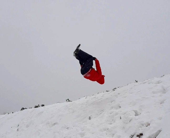 Joshua van Wees stuurde ons deze sportieve foto. Of hij het ook zelf is, hangend in de koude lucht, boven de sneeuw?