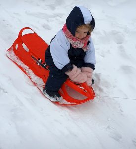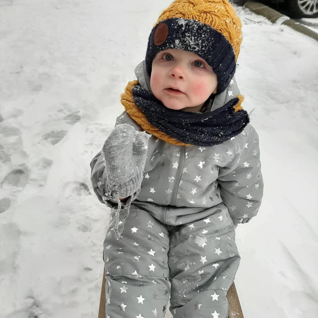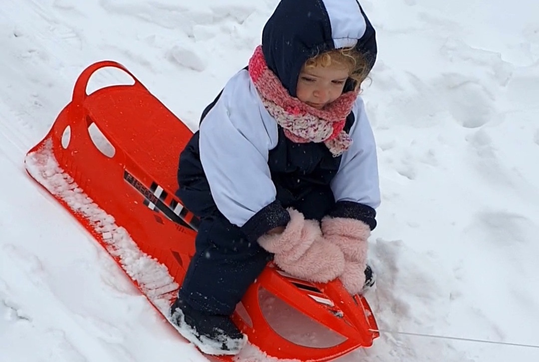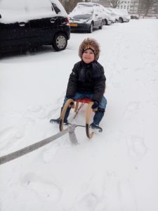 "Daan voor de eerste keer in de sneeuw. Hij wilde niet meer van de slee af!" (Debbie en Sander Erkens)