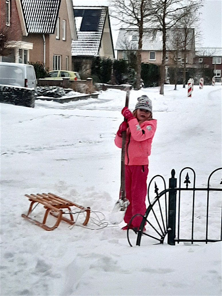 "Sayenna en Alysha Moors uit Bergharen samen naar het mooie geweldige bos in Bergharen om daar met de slee van de steile hellingen te gaan. En Sayenna is hard aan het werk om voor haar papa en mama de stoep schoon te maken" (Jessica Moors).