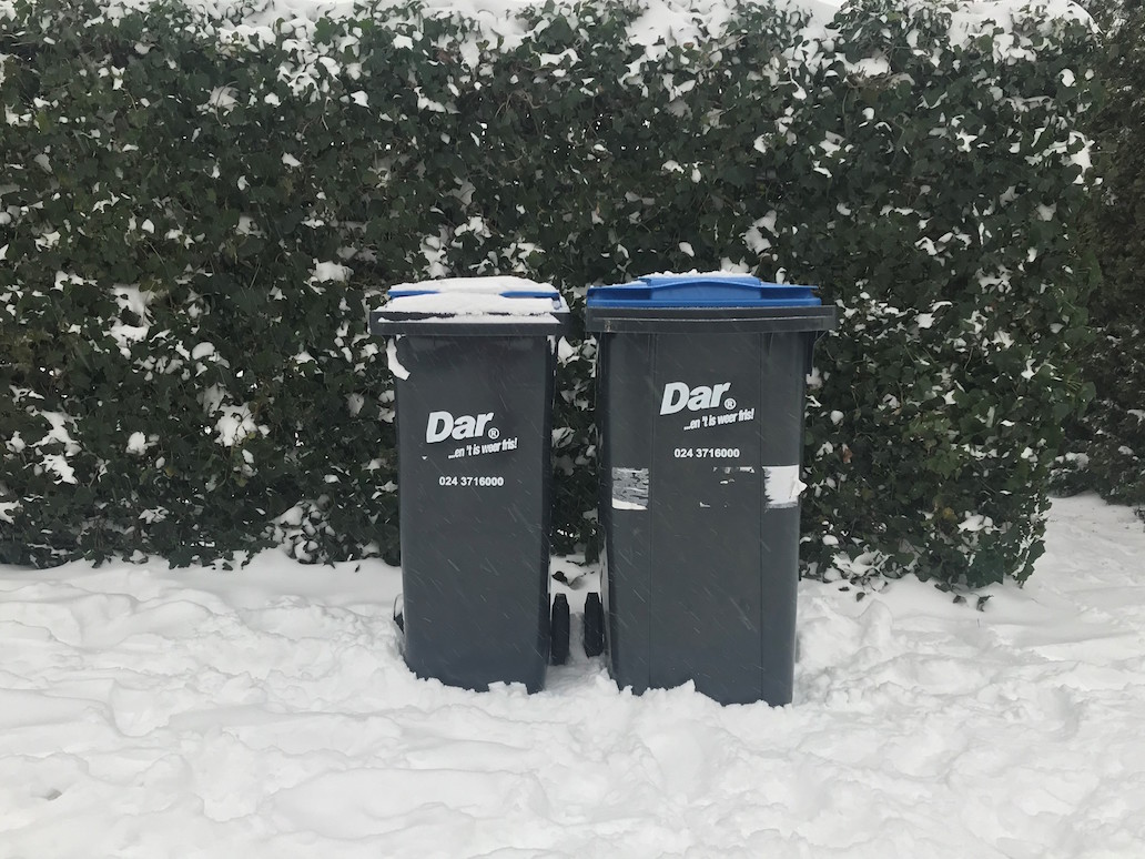 Eerder werd al bekend dat Dar op maandag 8 februari geen afval ophaalt in de regio. Dit blijft tot en met zaterdag 13 februari zo in de gemeenten Wijchen, Nijmegen, Berg en Dal, Beuningen, Druten, Heumen en Mook & Middelaar. Het is door de vele sneeuwval onveilig om met de grote vuilniswagens in de wijken te rijden. Dit geldt voor oud papier, gft-, rest- en plastic+afval. Onder- en bovengrondse containers leegt Dar wel. De strooiploegen proberen ervoor te zorgen dat deze veilig bereikbaar zijn. De milieustraten blijven ook open.