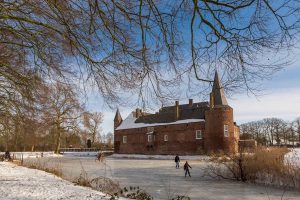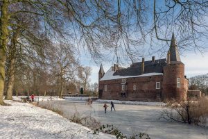 Sneeuw- en ijspretfoto's op de gracht rondom kasteel Hernen