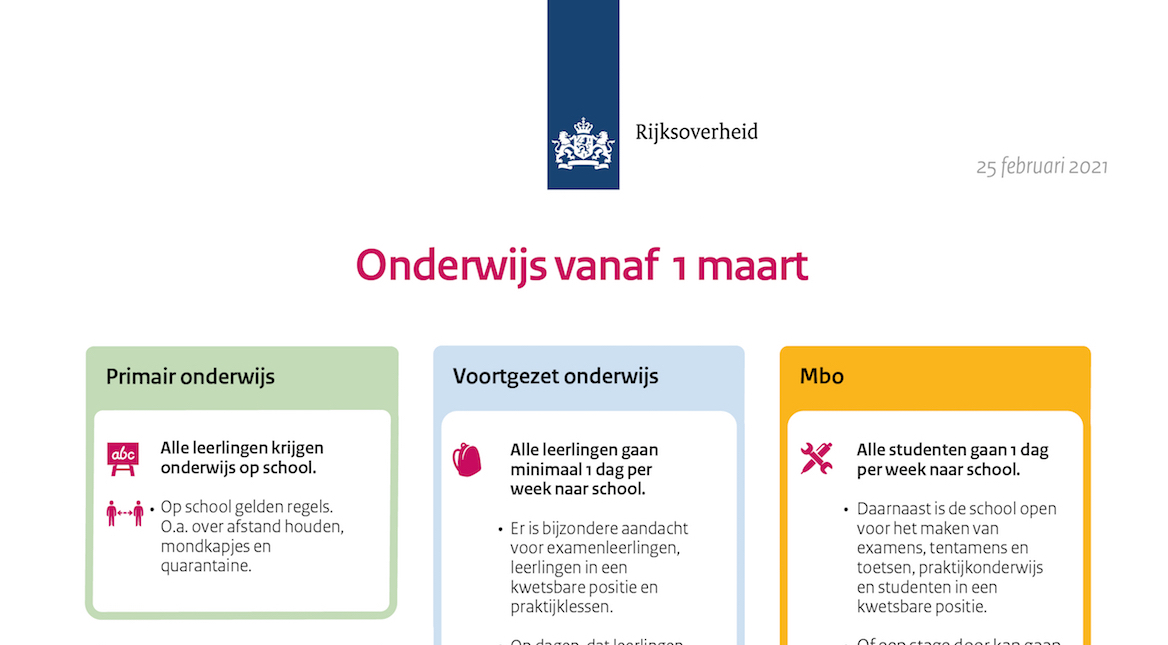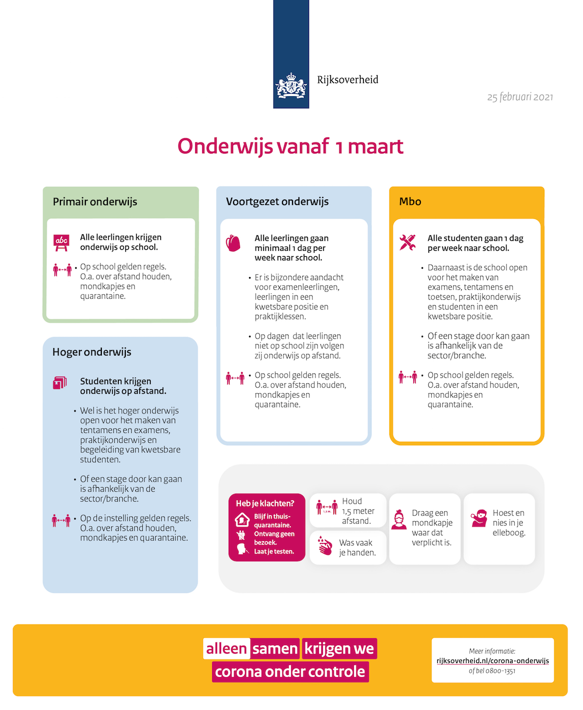De Veiligheidsregio Gelderland-Zuid zet nog even op een rijtje wat de coronaversoepelingen betekenen voor het onderwijs, dus het primair, voortgezet, mbo- en hoger onderwijs: "Het voortgezet onderwijs en mbo gaan vanaf maandag 1 maart weer open. Bekijk hier de situatie voor het hele onderwijs vanaf 1 maart."
