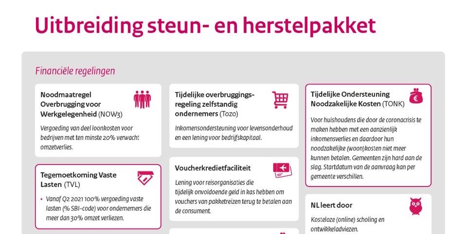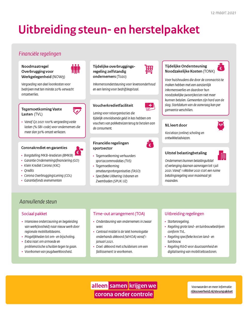 Ben je ondernemer en heb je vragen over het steunpakket? Bezoek http://Rijksoverheid.nl/steunpakket. Meer informatie over ondernemen in coronatijd: http://KVK.nl/coronaloket.