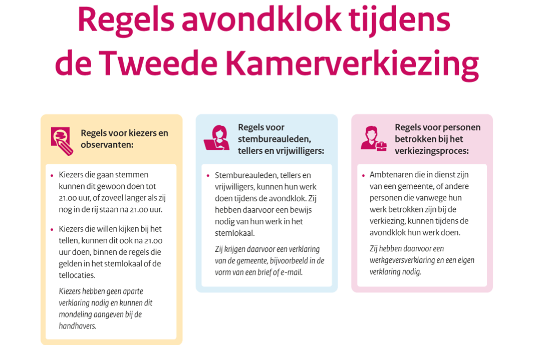 - Stembureauleden, tellers en vrijwilligers die betrokken zijn bij de organisatie van de Tweede Kamerverkiezing, kunnen hun werkzaamheden doen tijdens de avondklok. Zij hebben daarvoor een bewijs nodig van hun werkzaamheden op het stembureau. Zij krijgen daarvoor een verklaring van de gemeente, bijvoorbeeld in de vorm van een brief of een e-mail, waarin staat dat ze stembureaulid of teller zijn.