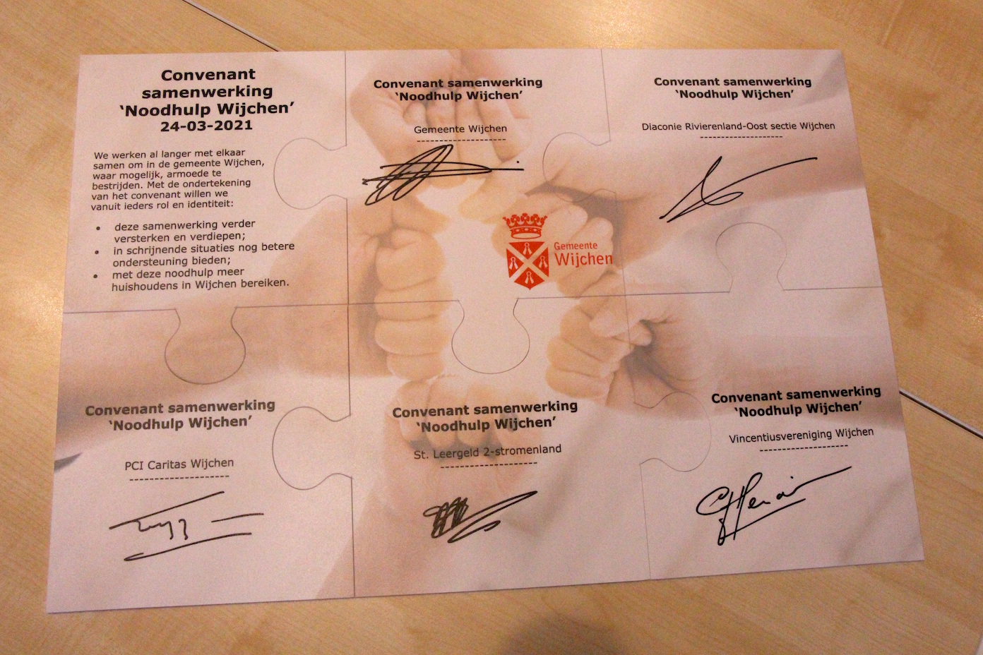 Diaconie Rivierenland-Oost sectie Wijchen, PCI Caritas Wijchen, St. Leergeld 2-Stromenland en Vincentiusvereniging Wijchen verstevigen hun samenwerking met de gemeente Wijchen. Samen ondertekenen zij het convenant ‘Noodhulp Wijchen’. In schrijnende situaties geven ze financiële steun aan inwoners. Zo bestrijden de samenwerkende partijen armoede nog beter.
