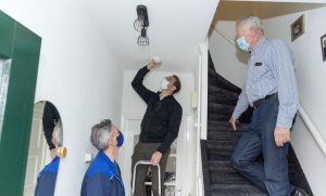 Foto: Ron van de Molengraft plaatst eerste rookmelder bij bewoner de heer Derks in Wijchen