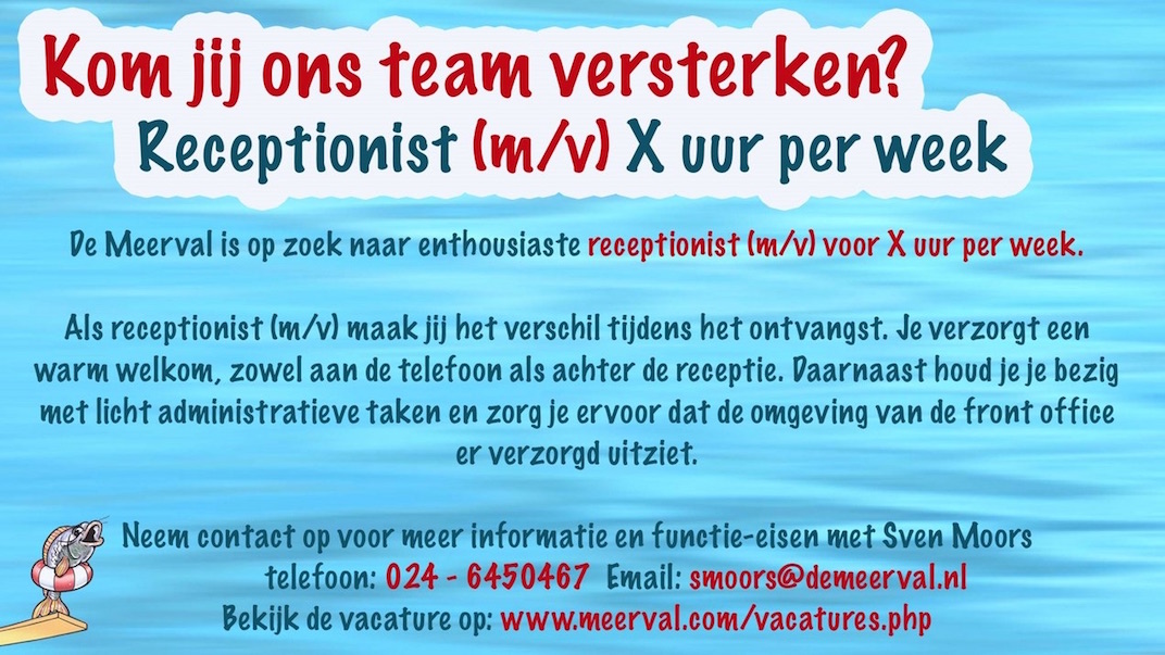 Zou je het leuk vinden om te werken bij het leukste zwembad van de omgeving? Dit is je kans! De Meerval is opzoek naar...