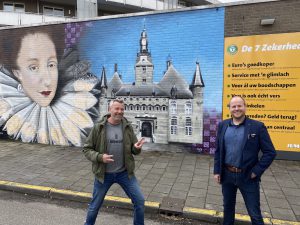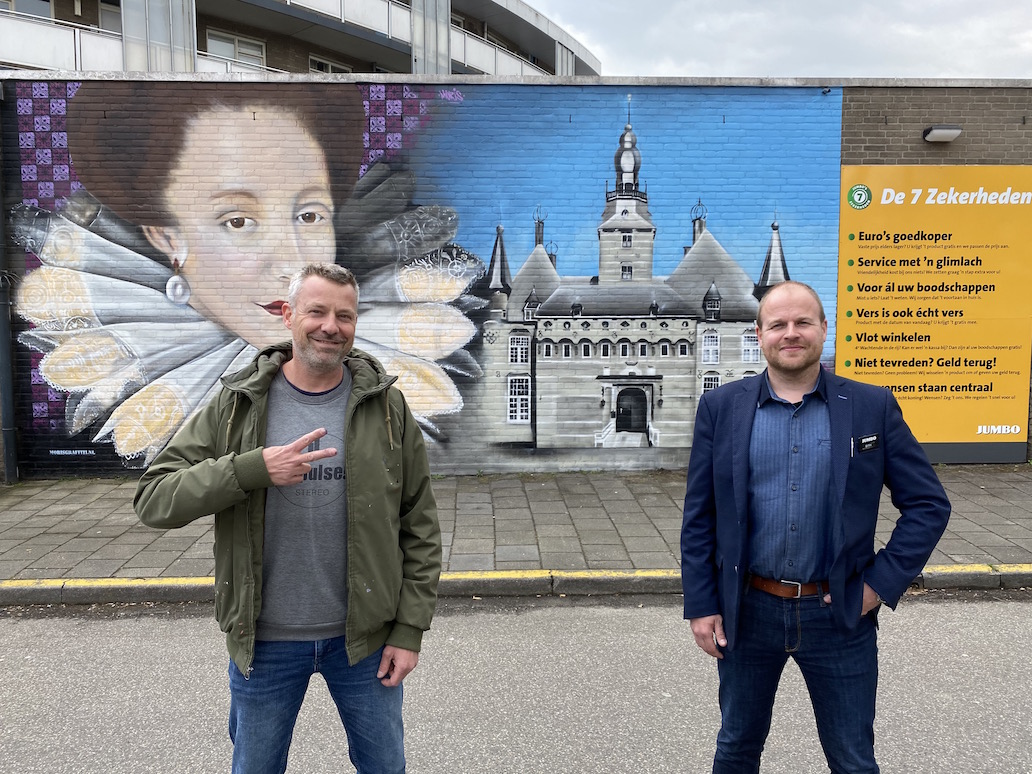 Kunstenaar Moris vertelt over zijn project: “Ja, en ik moest dus het ontwerp gaan bedenken en dacht direct aan een muur en aan Emilia van Nassau. Ik wilde het icoon Emilia, ooit gezeteld in ons kasteel, op een hoger niveau plaatsen. De jongste dochter van Willem van Oranje uit diens tweede huwelijk was immers zo’n 500 jaar geleden nogal eigengereid en dat sprak me wel aan.”