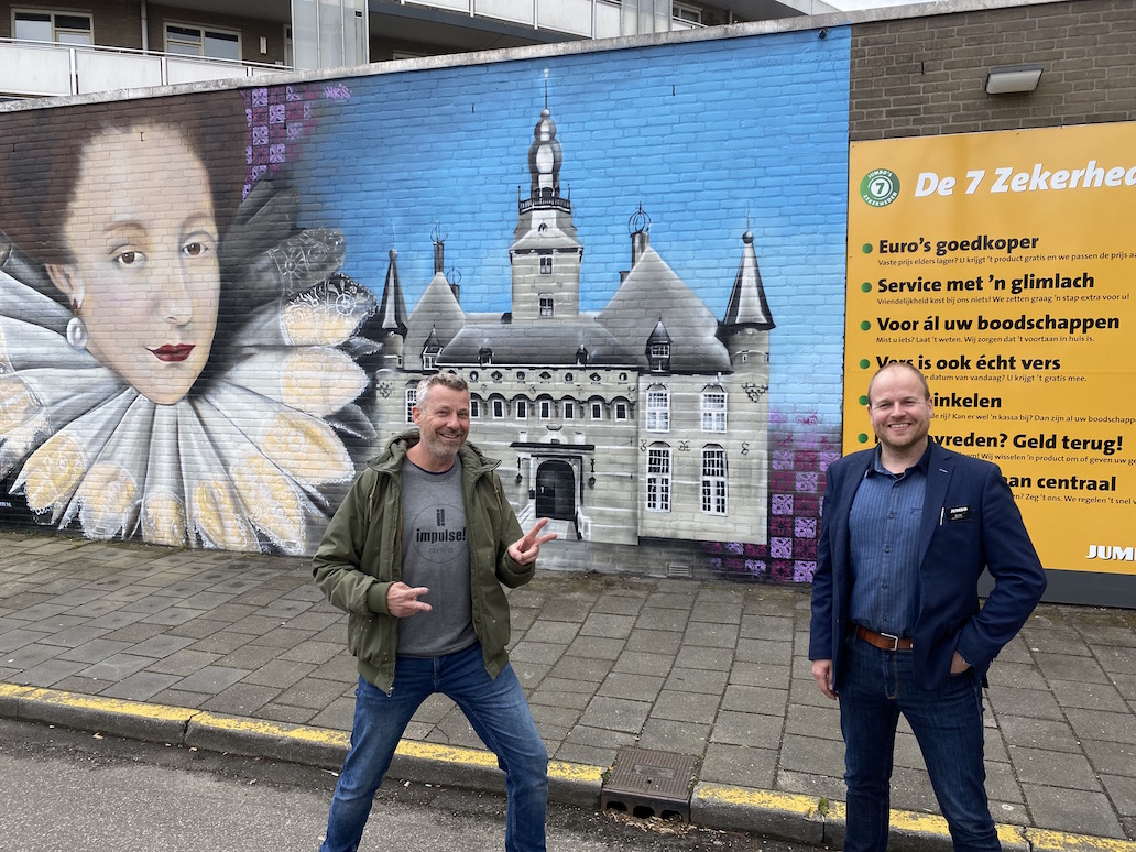 streetart en supermarkt prima is gelukt! Zo is deel 1 van de nieuwe Big Shopper van Jumbo Wijchen afgerond, maar een shopper heeft 2 kanten en dus is Moris de komende weken druk bezig op een muur aan de Jumbo Herenstraat. “Ik kan over deze muur nog niks zeggen. Het moet écht een verrassing worden”, laat de spuitbuskunstenaar enthousiast weten. En Dirk Beverloo ziet zijn bedachte idee alleen maar heel veel positieve reacties krijgen.