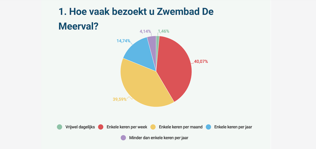 De meeste invullers zijn recreatieve en baantjeszwemmers die het zwembad vaak bezoeken. Gevolgd door zwemlesbezoekers. Wat opvalt is dat de grote meerderheid tevreden tot volledig tevreden is over zaken als kwaliteit en klantvriendelijkheid, de hygiëne, het activiteitenaanbod en de voorzieningen. Met betrekking tot de schoonmaak is de fractie ontevredenen sinds 2018 afgenomen. Toen was 13% van de respondenten ontevreden; nu nog 8%.