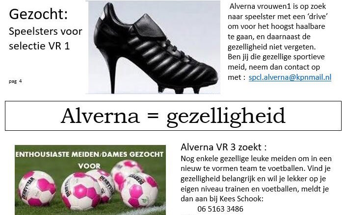 Maar Alverna zoekt óók nog enkele gezellige leuke meiden om in een nieuw te vormen Vrouwen 3-team te voetballen. Vind je gezelligheid belangrijk en wil je lekker op je eigen niveau trainen en voetballen, meld je dan aan bij Kees Schook: 06-5163 3486.