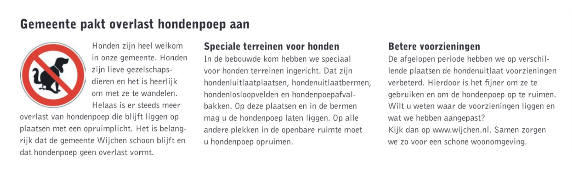 "Gisteren stond op de gemeentepagina van de Wegwijs de mededeling dat de gemeente de overlast van hondenpoep gaat aanpakken. Uit diverse publicaties blijkt het aantal honden in het afgelopen jaar, door m.n. corona, explosief te zijn gestegen met wel 20% en aannemelijk dus ook de hoeveelheid hondenpoep. Door deze toename van het aantal honden zullen ook de inkomsten van de hondenbelasting fors zijn toegenomen.