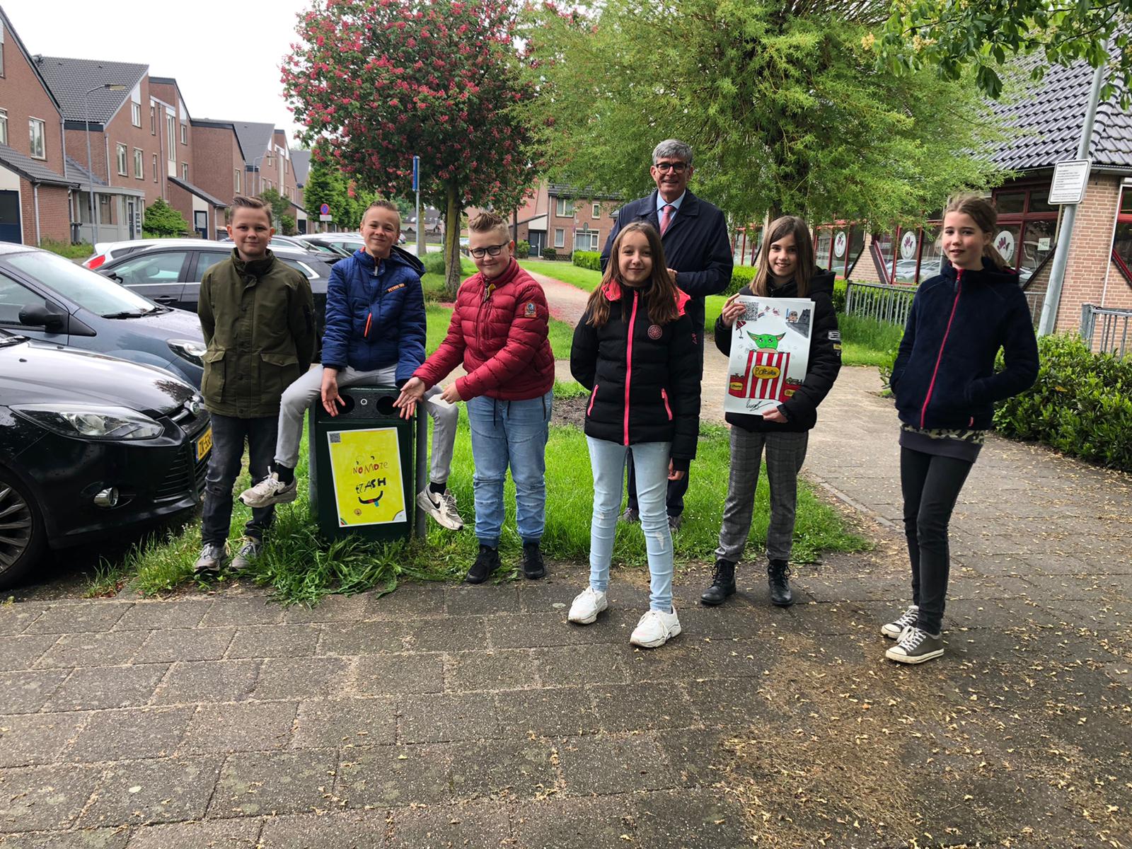 Wethouder Paul Loermans en kinderen van groep 8A van basisschool Het Zuiderpad plakten vandaag kleurrijke stickers op 28 afvalbakken in Wijchen-Zuid. Deze stickers zijn gemaakt van tekeningen van de kinderen. Zo vallen de afvalbakken lekker op. En het is een stuk leuker om je afval in zo’n mooie afvalbak te gooien. Zo zorgen we samen voor minder afval op straat en meer afval in de afvalbak.