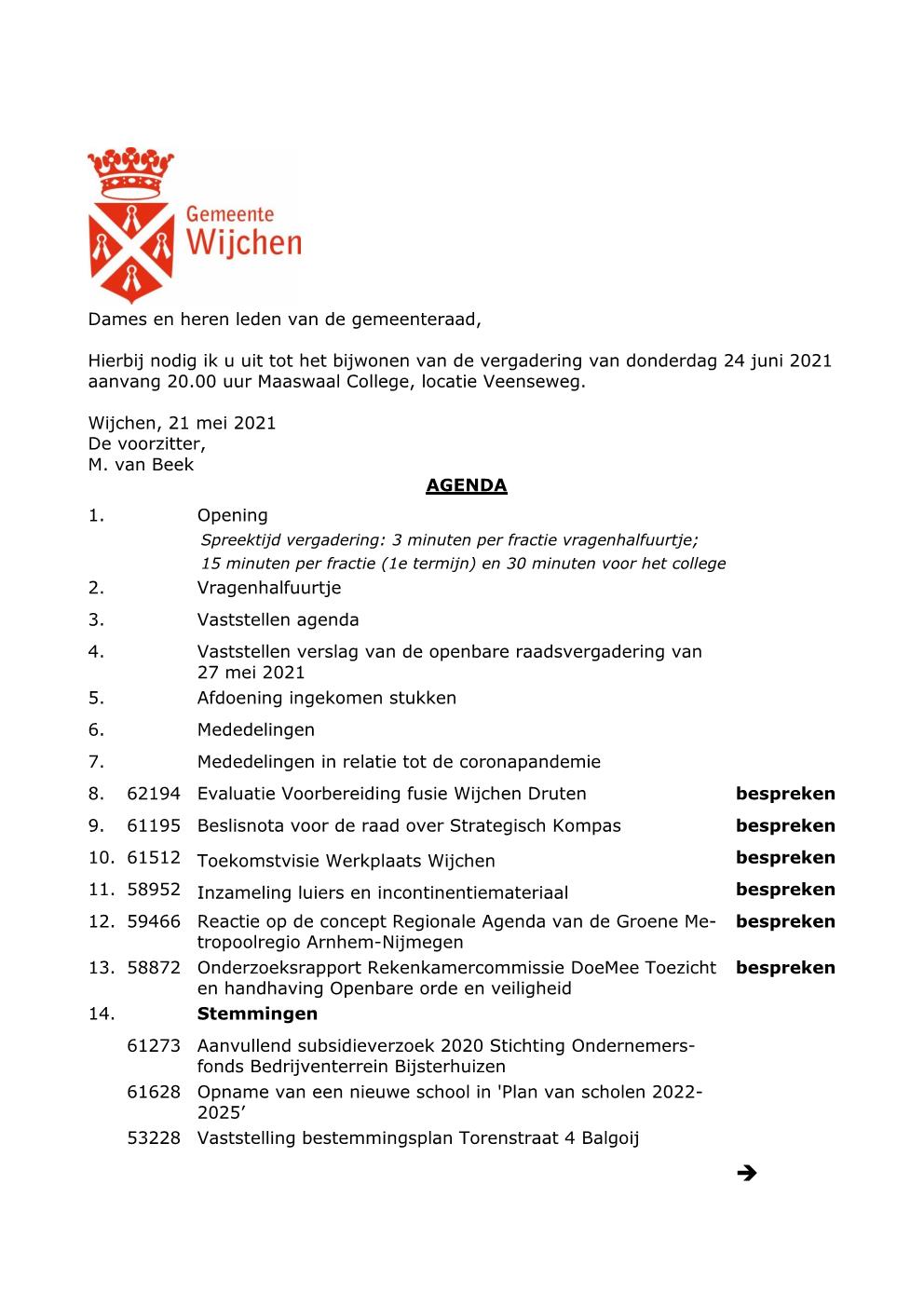 Aanmelden om in te spreken kan tot woensdag 23 juni 12.00 uur via griffie@wijchen.nl. Klik op de afbeeldingen voor de inhoud van de agenda:
