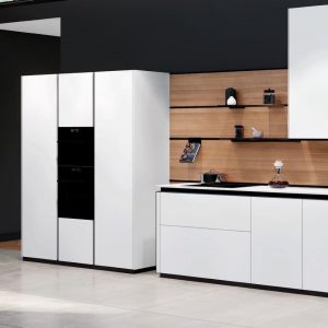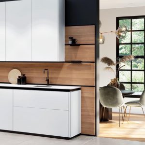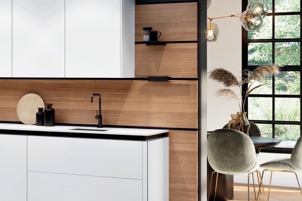 - Greeploze keuken met zwarte greeplijsten, die mooi contrasteren bij het lichte front.