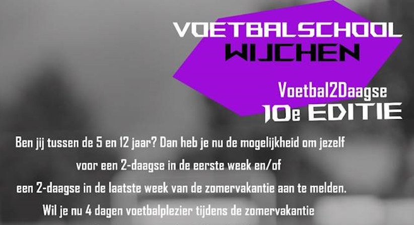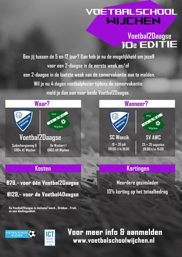 Tijdens de zomervakantie organiseert Voetbalschool Wijchen voor de tiende keer de Voetbal2daagse op het sportpark van SC Woezik en/of sv AWC. Klik op de illustratie hieronder voor alle data en andere info.