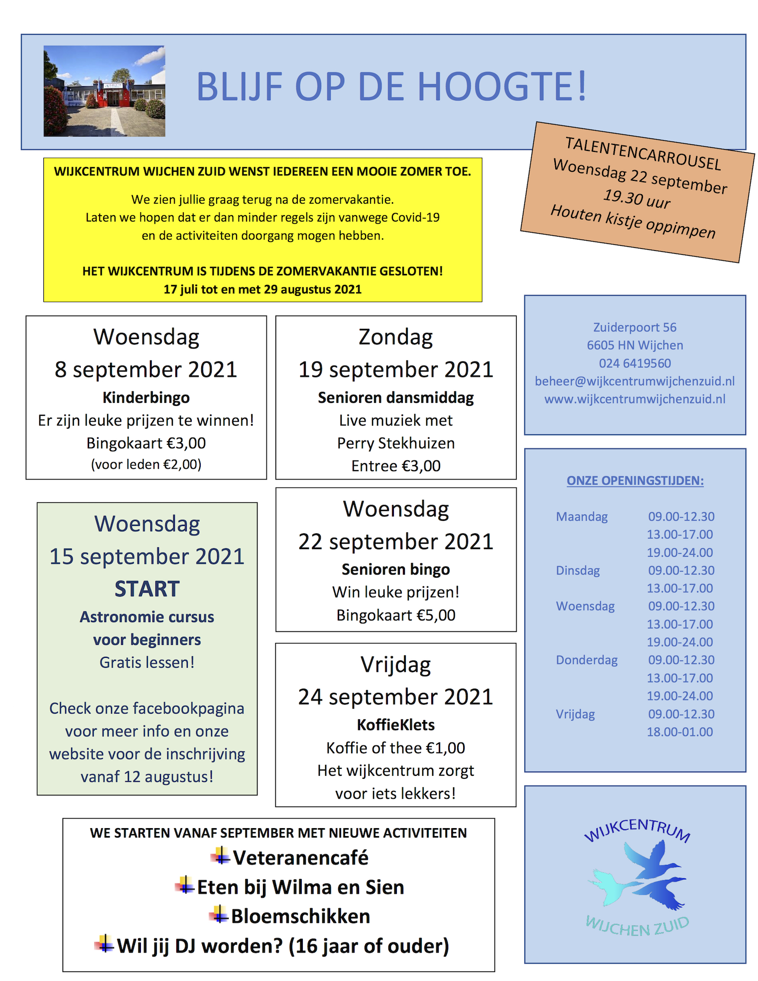 Wijkcentrum Wijchen Zuid houdt u geregeld op de hoogte van het laatste nieuws met de flyer “Blijf op de hoogte!”. Klik daarvoor op het plaatje hieronder, ook voor de nieuwe activiteiten die na de zomervakantie gaan plaatsvinden, zoals het 'Veteranencafé' en 'Eten bij Wilma en Sien'.