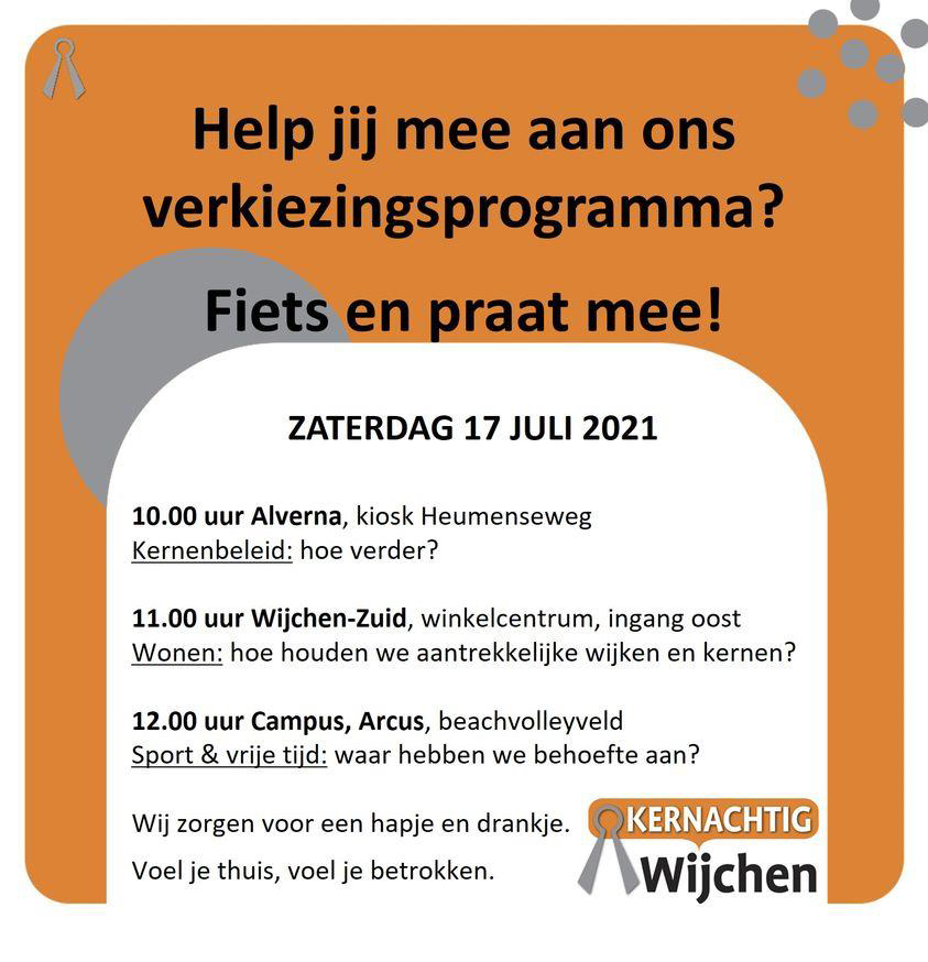 Aanstaande zaterdag 17 juli is het programmateam van de politieke partij Kernachtig Wijchen op drie locaties in Wijchen aanwezig om te luisteren naar wat jij belangrijk vindt voor de komende periode. Op elke locatie wordt één onderwerp besproken. Natuurlijk onder het genot van een hapje en drankje.