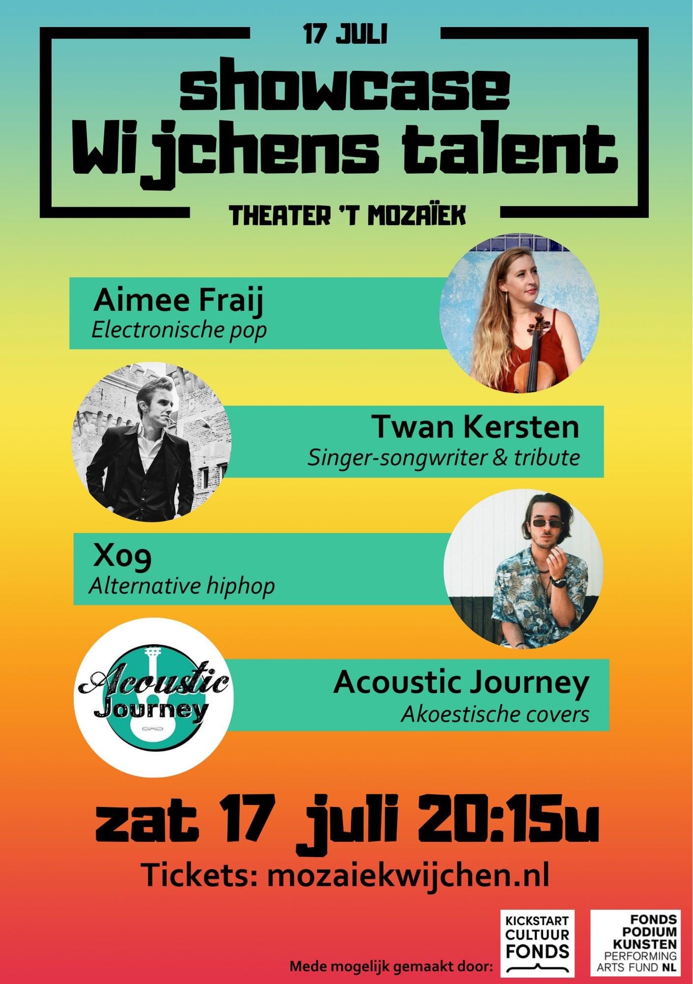 Op Zaterdag 17 juli staan de Wijchense talenten Acoustic Journey, Twan Kersten, Aimee Fray en X09 in het buitentheater aan de Campuslaan 6!