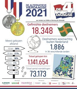 Koninklijke Wandel Bond Nederland, Stichting DE 4DAAGSE en House of Sports organiseerden deze week voor de tweede keer 'De Alternatieve Vierdaagse'. Verspreid over heel Nederland én ver daarbuiten hebben ruim 18.000 deelnemers vandaag hun gekozen afstand van 5, 10, 20, 30, 40 of 50 kilometer voltooid. In andere tijdszones op de wereld zijn wandelaars nog