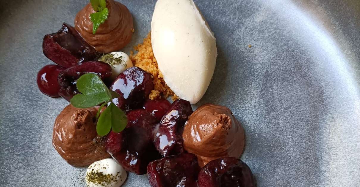 Kersen van Tuinderij ’t Tuureind met crème van pure chocolade, hangop, groene thee en ..