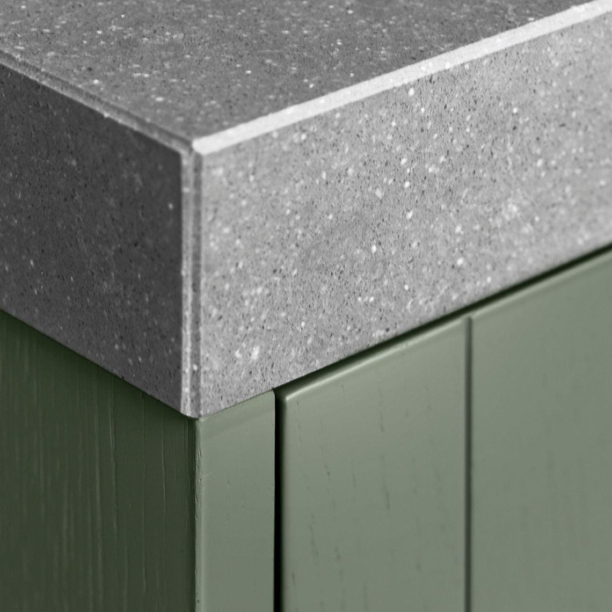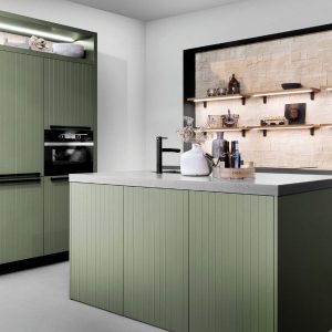 “De fronten met verticale groeven zijn in de warme kleur Tundra. Een warm grijs, mat werkblad, een stoere, zwarte kraan en zwarte grepen maken de keuken helemaal af. Sfeervol detail zijn de wandplanken met zwarte, metalen legplankdragers.”