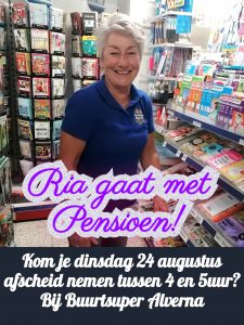 De gezellige Buurtsuper Alverna laat op haar media weten: “Onze lieve Ria gaat met pensioen! Na ruim 20 jaar trouwe dienst mag ze gaan genieten van haar welverdiende rust.