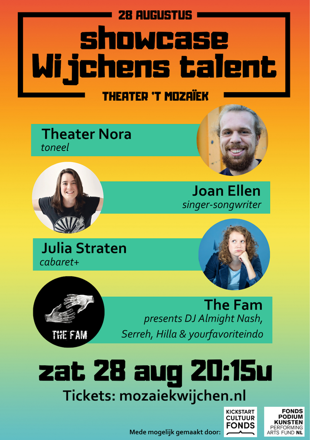 In en om Wijchen barst het van het talent, op 28 augustus krijgt het publiek een grote variatie aan lokale artiesten te zien. Kleinkunstig cabaret, eigenzinnig toneel en muziek die recht uit het hart komt, veel afwisseling om heerlijk van te genieten! Geniet van The Fam, Theater Nora, Joan Ellen en Julia Straten.