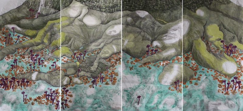 Susan Reijnders verkende eerst in haar monumentale inktschilderingen de imposante wortels van de boom.