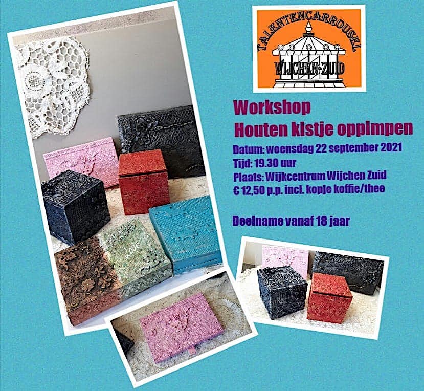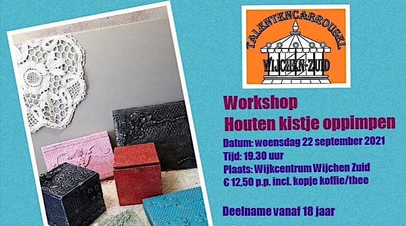 In Wijkcentrum Wijchen Zuid is in het kader van de Talentencarrousel op woensdagavond 22 september een Workshop houten kistje oppimpen. Deelnemersbijdrage: 12,50 (incl. kopje koffie/thee).