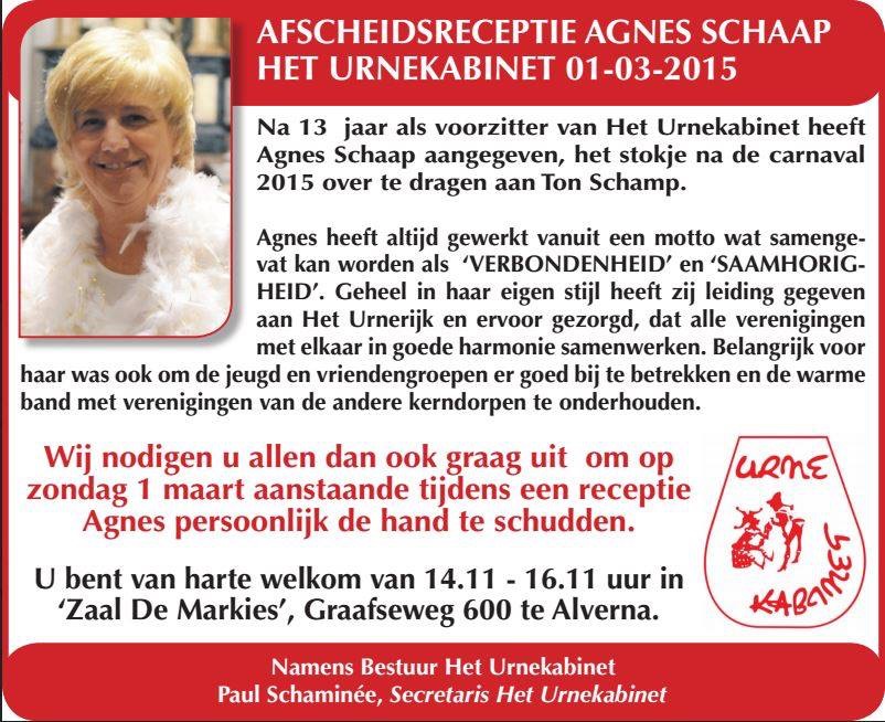 Na 13 jaar voorzitterschap van het Urnekabinet, draagt Agnes Schaap het stokje over aan Ton Schamp. Op zondag 1 maart, vanaf 14.11 uur, is haar afscheidsreceptie in De Markies in Alverna. Iedereen is van harte welkom. Klik op de afbeelding hieronder voor meer informatie.