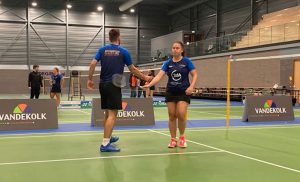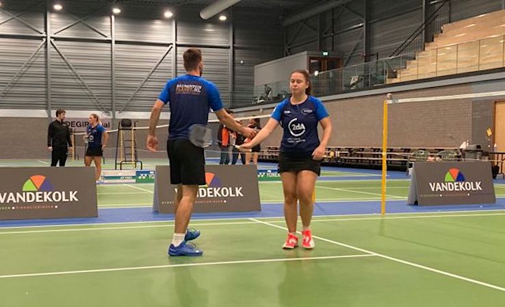 Lieke en Yannic moesten even aan elkaar wennen in de eerste set tegen Gijs en Charissa Kuiper. Logisch natuurlijk, want ze stonden als gelegenheidsduo op de baan. De eerste set moesten ze aan DKC laten (21-17), maar de tweede set wisten ze op het nippertje te pakken (21-23). En zo ging het ook in deze wedstrijd gelijk op tot het eind, maar pakte DKC uiteindelijk toch de winst (21-19).