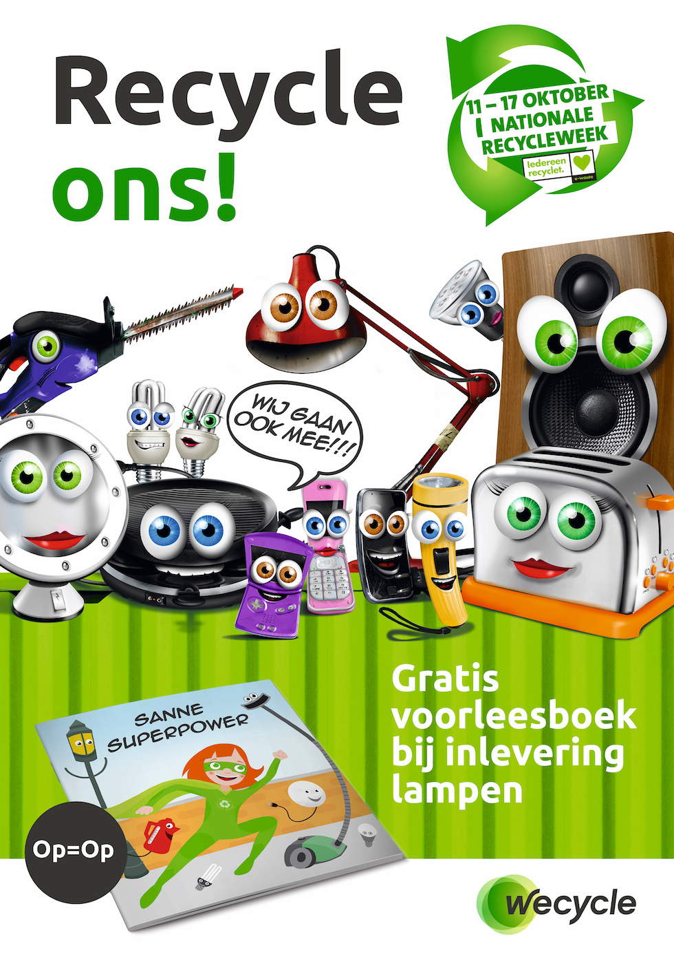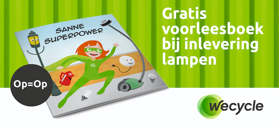 Tijdens de Nationale Recycleweek (11 - 17 oktober) ligt er voor snelle inleveraars van lampen en ander e-waste bij de gemeentelijke milieustraat en heel veel kringloopwinkels een leuk cadeautje klaar, een gratis voorleesboekje: Sanne SuperPower. Op een leuke manier leren de jongste inwoners en hun (groot) ouders alles over recyclen. Wees er snel bij, op=op!