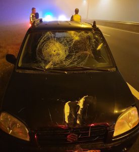 De politie Wijchen meldt: "In de vroege ochtend van 7 oktober kregen wij de melding dat het voertuig op de foto met 40 kilometer per uur en met een kapotte voorruit over de A50 richting Nijmegen kwam gereden. Op de A73 vlak voor Nijmegen konden wij de bestuurster uiteindelijk tot stoppen dwingen.