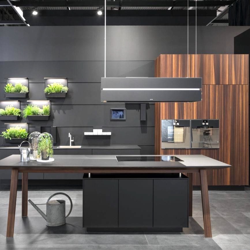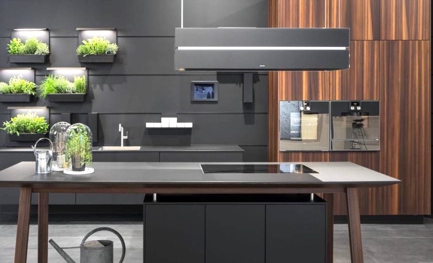 Deze Next125-keuken is uitgevoerd met Fenix-materiaal en notenhout. Doordat het kookeiland op een tafel lijkt, past deze keuken perfect in een open woning.