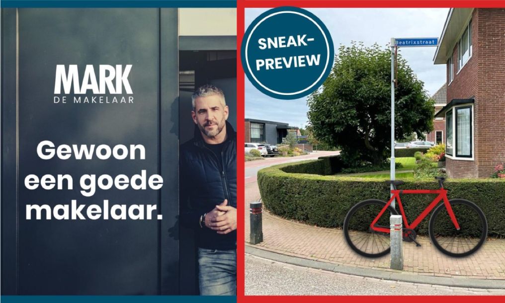 “Er komt binnenkort iets moois aan. Een ruim huis in deze straat... Meer weten? Houd mijn site en socials in de gaten!” vertelt Mark de makelaar enthousiast. Kijkt u regelmatig op