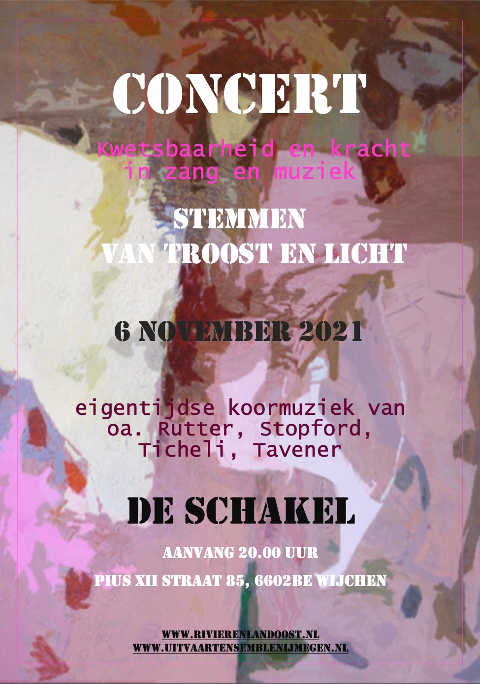 Op zaterdag 6 november om 20.00 uur zal het koor Stemmen van Troost en Licht (www.uitvaartensemblenijmegen.nl) een concert geven in de Schakel te Wijchen in het kader van het thema kwetsbaarheid en kracht. In zang en muziek zijn kwetsbaarheid en kracht nauw met elkaar verbonden. Het getuigt van kracht als je over je kwetsbaarheid kunt zingen. Anderzijds wordt muziek die alleen maar kracht uitstraalt oninteressant. Koorwerken van eigentijdse componisten als Gjeilo, Ticheli, Stopford, Rutter en Tavener zullen ten gehore worden gebracht.