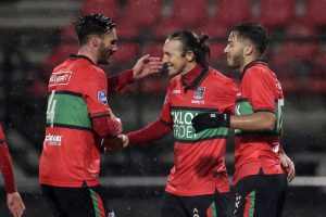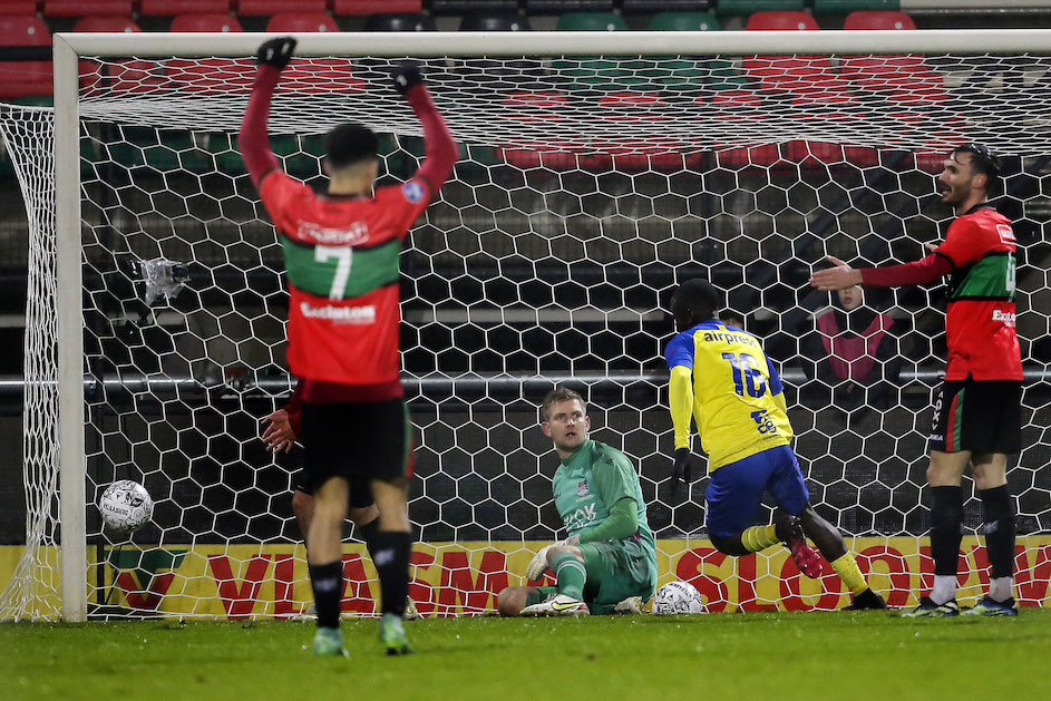 Het is rust en de voorsprong is verdiend, terwijl Cambuur iets meer balbezit heeft. Maar het is nog lang niet binnen. In de 47e minuut is er een corner, want NEC valt direct aan en gaat op zoek naar de 3e treffer. In de 51e minuut een vrije trap van Cambuur op 27 meter van het doel. Daaruit scoort Uldrikis omdat Branderhorst de aangeraakte bal niet naar de zijkant kan krijgen. Het is 2-2; wat een slechte start van de 2e helft!