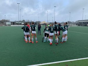 Vanaf de eerste minuut wist Wijchen met goed combinatiespel de tegenstander terug te dringen. Ook in verdedigend opzicht hadden de dames volledig de controle, waardoor het spelbeeld eenzijdig was. Dit leidde tot meerdere goed uitgespeelde aanvallen en kansen. Alleen al in de eerste helft kwamen de Dames uit Wijchen 19 keer de cirkel binnen van de tegenstander. Helaas resulteerde dit in maar één doelpunt, gemaakt door Femke Sewalt. Hierdoor was de ruststand 0-1.