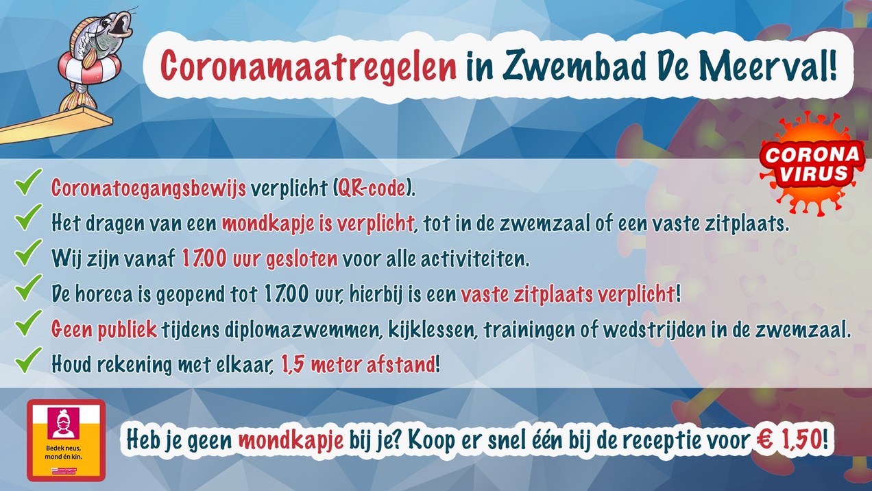 Zwembad De Meerval meldt: "Naar aanleiding van de persconferentie op 26 november 2021, zijn er ook voor ons bad diverse maatregelen.