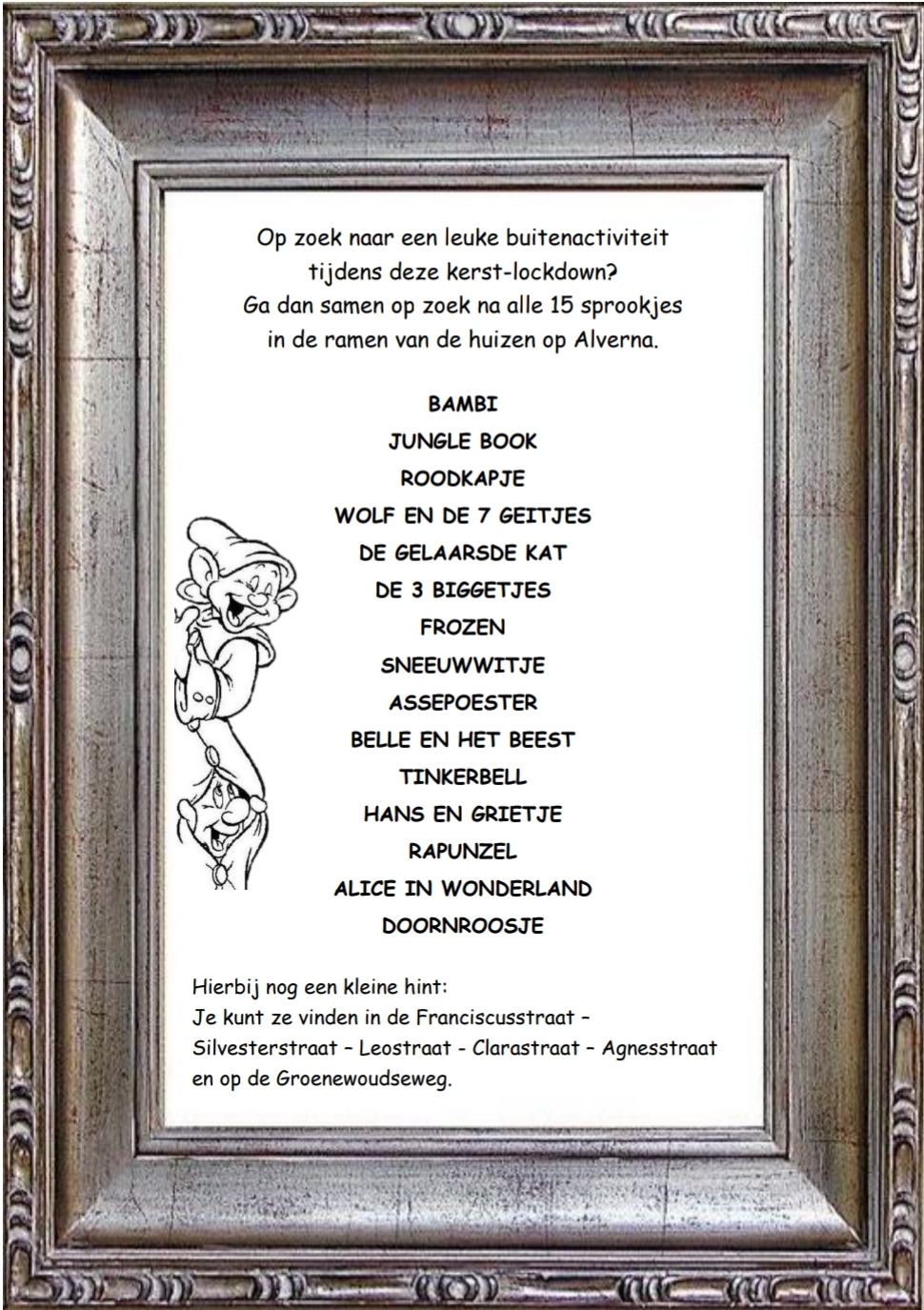 Op zoek naar een leuke buitenactiviteit tijdens de kerst-lockdown? Ga samen op zoek naar alle 15 sprookjes in de ramen van de huizen op Alverna!