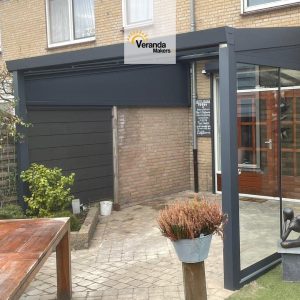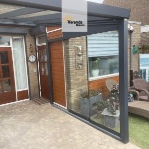 “In Wijchen hebben we deze veranda met glazen dak mogen plaatsen”, laat Wesley Welgraven van Verandamakers trots weten. “Aan één zijkant is gekozen voor een glazen schuifwand die achter de vaste muur weggeschoven kan worden. Zo zit de klant beschut tegen de wind wanneer de glazen schuifwand dicht is, maar behouden zij de volledige doorloop wanneer de glaswand open staat.”