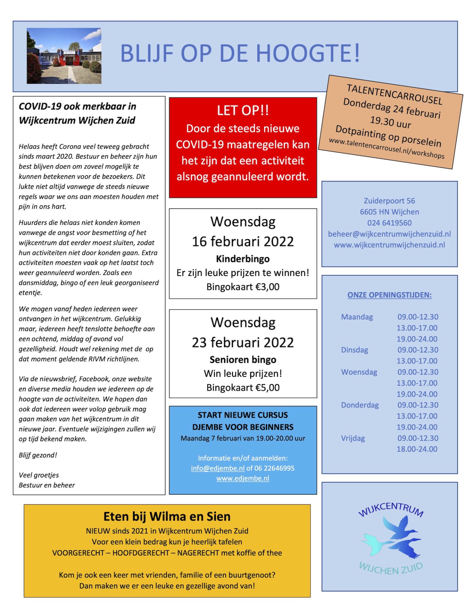 De beheerders van het wijkcentrum in Wijchen-Zuid melden blij: "We mogen vanaf heden iedereen weer ontvangen in het wijkcentrum. Gelukkig maar, iedereen heeft tenslotte behoefte aan een ochtend, middag of avond vol gezelligheid. Houdt wel rekening met de op dat moment geldende RIVM-richtlijnen."