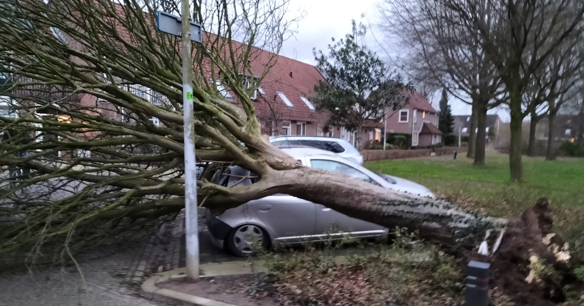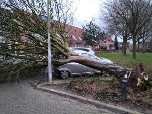 Sandra Mulder laat weten: "Mijn auto stond naast de boom. De boom waaide de andere kant op. Bovenop de auto van een van de buurtbewoners, deze had helaas minder geluk, de auto is total loss."