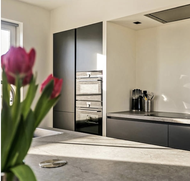 Karakteristiek voor designkeukens zijn de strakke lijnen en bewuste symmetrie. Zo ook deze designkeuken. Het front met geïntegreerde greeplijst, de beste apparatuur op (veilige) ooghoogte en een luxe stenen werkblad. Voer voor liefhebbers van designkeukens.