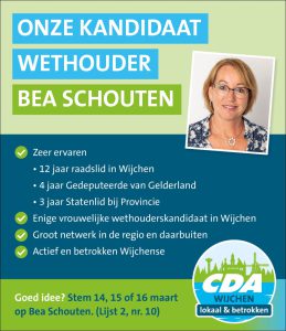 Bea Schouten vertelt vol enthousiasme over haar overwegingen om zich kandidaat te stellen voor de positie van wethouder in de gemeente Wijchen: “Ik ben erg blij dat het CDA Wijchen mij gevraagd heeft als kandidaat wethouder. Het is een prachtige functie waarin ik mijn ervaring kan inzetten voor onze mooie gemeente Wijchen. Ik verwacht ook profijt te hebben van mijn netwerk in de regio en in de provincie Gelderland. Dat zal zeker helpen om Wijchen nog beter op de kaart te zetten. Wethouder zijn van de gemeente waarin ik al jaren met veel plezier woon lijkt mij geweldig en eervol! Daarom hoop ik op voldoende steun vanuit de kiezers, zodat wij als CDA Wijchen weer in het college kunnen komen.”