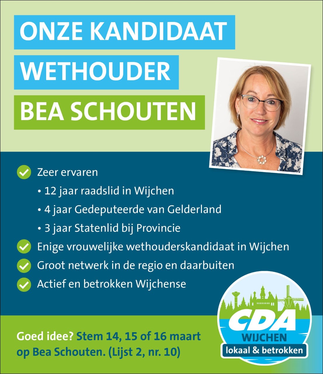 Bea staat op plek 10 van lijst 2 voor het CDA Wijchen. Op 14, 15 en 16 maart kunt u gaan stemmen voor de gemeenteraadsverkiezingen.