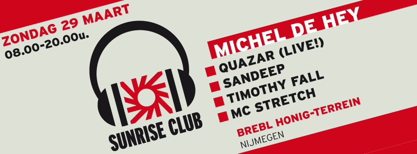 Op Facebook: sunrise club staat alle informatie over de kaartverkoop. Ga dus genieten van Quazar live, Michel de Hey, Sandeep, MC Stretch en Timothy Fall.