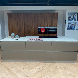 "Een kijkje bij een van onze showroommodellen. De lichte fronten van dit eiland gecombineerd met de donkere hoge kast geven een mooi contrast aan deze keuken."