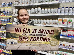 Vanaf nu t/m 3 april is elk 2e artikel van de Golden Naturals vitamines & mineralen voor de helft van de prijs! Tevens heeft u ook nog de mogelijkheid om de gouden dop in te leveren waarmee u nogmaals €2,- korting ontvangt! U ziet maar weer eens wat de voordelen zijn van de gezellige Voordeeldrogist in Winkelcentrum Wijchen Noord aan de Tunnelweg 44!